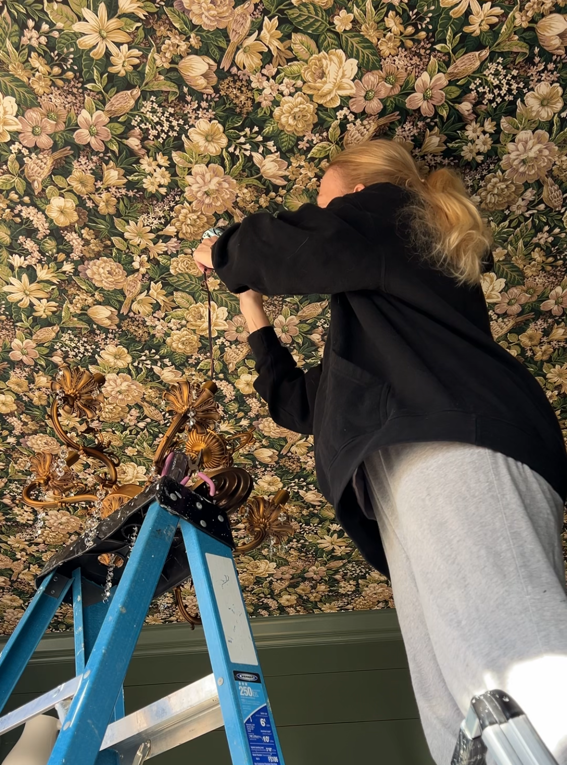 I recently gave my breakfast room a dramatic makeover, which you can read all about in this post: How to Make a Room Dramatic and Moody with Dark Green Paint. Be sure to check it out to see the full before-and-after transformation and get inspired with rich green paint color ideas and recommendations. One of the most striking updates in the space is the patterned wallpaper on the ceiling. Often called the “fifth wall” in interior design, the ceiling is an overlooked opportunity to add visual interest and depth to a room. Today, we’re going to dive into exactly how to hang peel-and-stick wallpaper on the ceiling for a polished, professional finish. Even if you’ve never done it before, I hope this post gives you the courage to try something new in your space!
